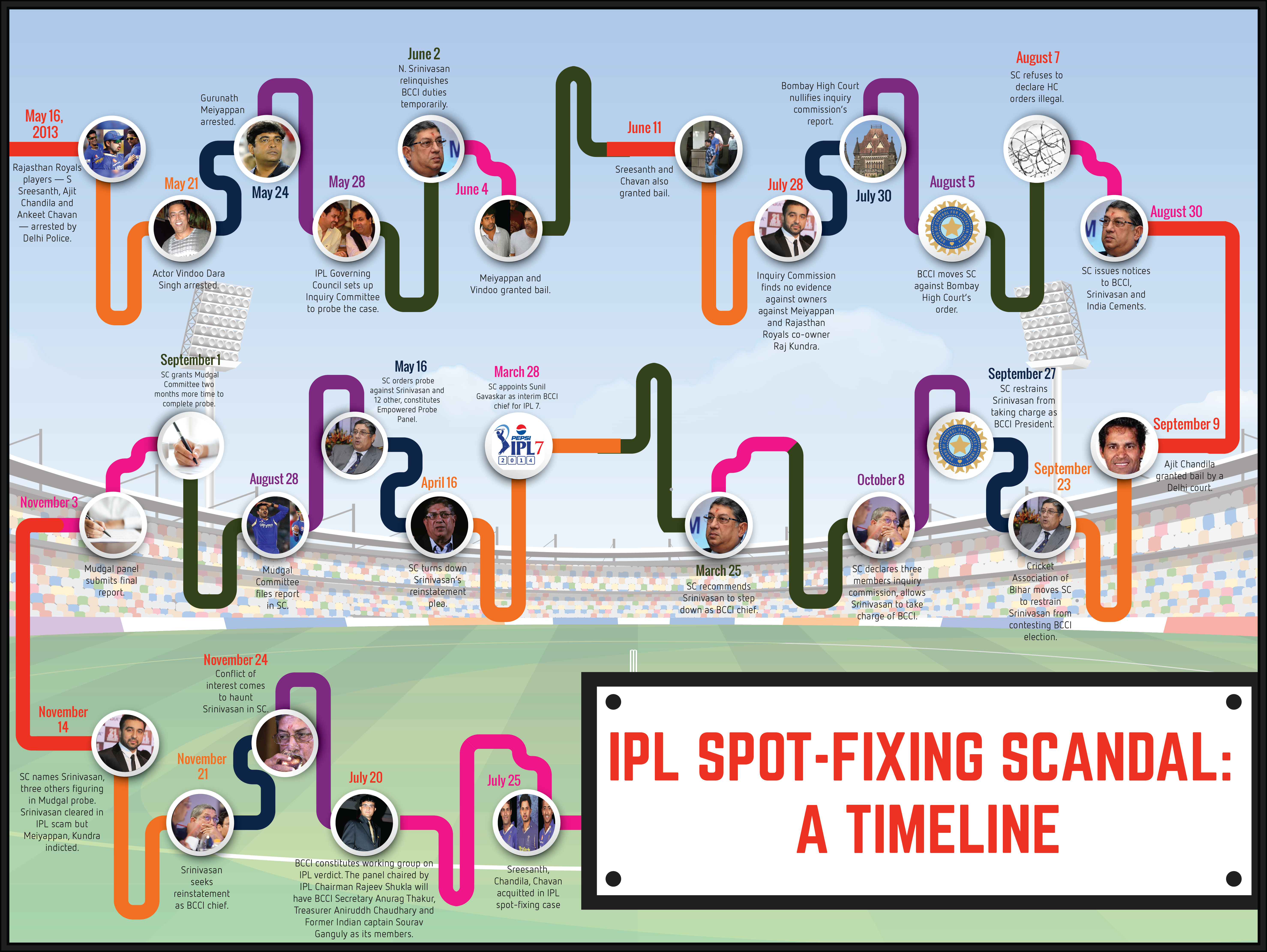 Call records of Vindu Dara Singh in connection with the spot fixing scandal showed that he was in frequent contact with Chennai Super Kings (CSK) Team Principal and BCCI president N. Sreenivasan’s son in law Gurunath Meiyappan. To investigate whether frequent calls to Mr. Meiyappan were for betting, Mumbai Police had issued summons to him On 24 May 2013, Gurunath Meiyappan was arrested on charges of betting, conspiracy and cheating after he was questioned by the Mumbai Crime Branch. After his arrest, the CSK franchisee immediately disowned him. In a press statement on 24 May 2013, India Cements, which owns the CSK franchisee — said “Mr. Meiyappan is neither the owner, nor the CEO/Team Principal of the Chennai Super Kings. [He] is only one of the members (Honorary) of the management team of the Chennai Super Kings.” The main reason for the immediate disowning of him was that, his arrest could lead to termination of the CSK franchise. This was because of the Clause 11.3 (c) of the Franchise Agreement, which stated that “a franchise may be terminated immediately if the Franchisee, any Franchisee Group Company and /or any Owner acts in any way which has a material adverse effect upon the reputation or standing of the League, BCCI-IPL, BCCI, the Franchisee, the Team (or any other team in the League) and/or the game of cricket.” On 26 May, BCCI announced that a three member commission will investigate the role of Mr. Meiyappan in the spot-fixing and betting scandal. On 31 May 2013, a senior Mumbai Police official said that Mr. Meiyappanan had been warned by an official from the International Cricket Council’s ACSU.\ Mr. Meiyappan was later released on bail by a Mumbai court on 3 June 2013.