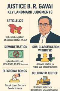 Justice Gavai authored nearly 300 judgments during his time in the Supreme Court and sat on close to 700 benches, including some of the most significant Constitution Benches of recent times. His judicial approach can be understood through the major decisions he participated in or authored: