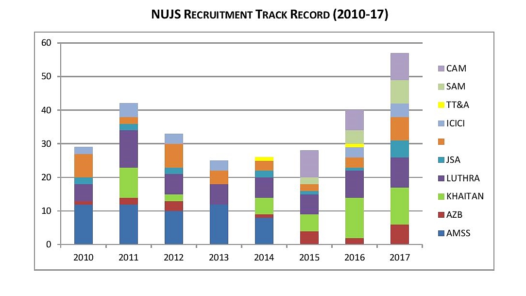The NUJS’ class of 128 students which graduated this year secured 78 jobs on and off campus. The collective efforts and individual brilliance of the students led to this phenomenal result, with a significant chunk of students opting for recruitment bagging PPOs (Pre-placement offers) by excelling at their respective internships.